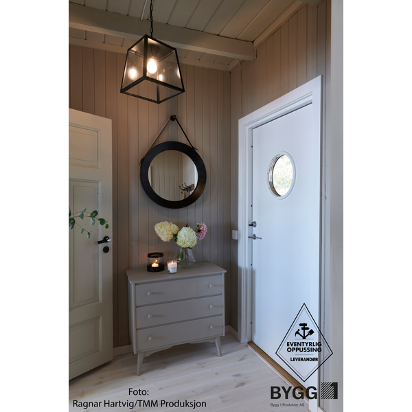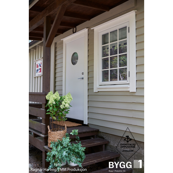 Ytterdør i eksklusiv og tidløst design med enestående isolering. Flott dør med moderne designet. 3-lags klart isolerglass. Robust dør med vannbestandig HDF, dobbelt ramtre og 78mm isolasjon. 53x115 mm furukarm med tre-fire justerbare hengsler Assa 3248-110 TMK SS med bakkantsikring, to pakninger og 25 mm HC terskel av lasert bjørk og aluminium. FG låssystem med langskilt på inn- og utside. Dørblad og karm er malt med 2-komponent hvitmaling som standard (NCS S0502-Y), andre farger på bestilling. U-verdi på 0,65.