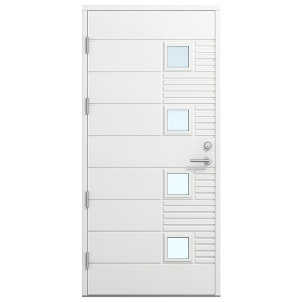 Ytterdør i eksklusiv og tidløst design med enestående isolering. Flott dør med moderne design. 3-lags klart isolerglass. Robust dør med vannbestandig HDF, dobbelt ramtre og 78mm isolasjon. 53x115 mm furukarm med tre-fire justerbare hengsler Assa 3248-110 TMK SS med bakkantsikring, to pakninger og 25 mm HC terskel av lasert bjørk og aluminium. Karmene er forbora Ø14mm og det er montert 28mm karmhylse + løs 6.9x45 betong/treskru og plugg T8. FG låssystem med langskilt på inn- og utside. Dørblad og karm er malt med vannbasert hvitmaling som standard (NCS S0502-Y), andre farger på bestilling. U-verdi på 0,80.