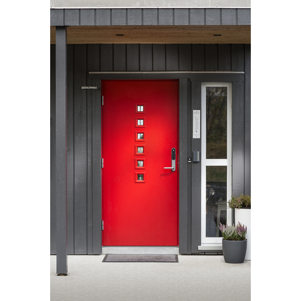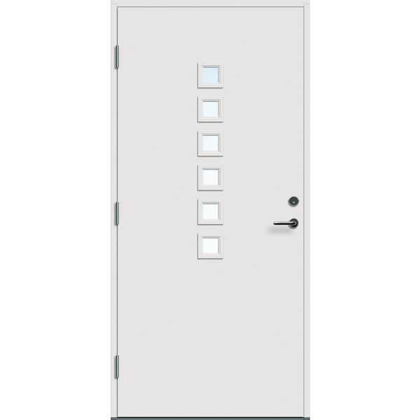 Ytterdør i moderne design med glass og god isolasjonsevne i høy kvalitet. Med hele fire strøk maling på utsatte steder og glasslister og sprosser i PVC, er døren konstruert for å tåle vårt nordiske klima. Klart 2-lags energisparende isolerglass er standard, men kan også lages med cotswold, crepi, frosta eller sota glass. Ramtre av fingerskjøtt furu og laminert finer (LVL) og 54 mm EPS isolasjon. Karm av kvistfri furu 44x105 mm. Terskel av eik og aluminium tilpasset bevegelseshindrede. Matt krom sylinder TV5596C, sluttstykke LP712, låskasse Assa 8765 og tre justerbare hengsler 3248-110 med bakkantsikring. Standard fargekode på karm og dørblad er NCS S 0502-Y, andre farger på bestilling. U-verdi 1,00 W/m2. For mer informasjon se www.bygg1.no