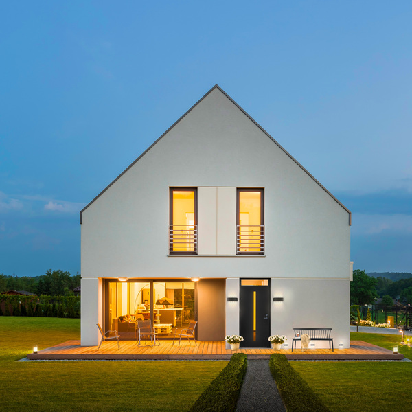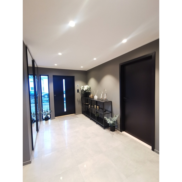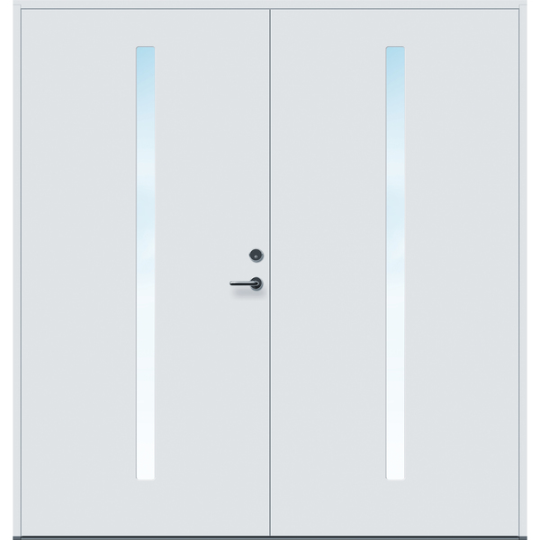 Ytterdør med minimalistisk stilreint design uten glasslister og med skjulte hengsler.Døren har god kvalitet og er behandlet for å tåle vårt nordiske klima. Ramtre av fingerskjøtt furu og laminert finer (LVL), 54 mm EPS isolasjon. Klart 3-lags glass er standard, men kan også lages med cotswold, crepi, frosta eller sota glass. Kvistfri furukarm 44x105 mm med terskel av eik og aluminium. FG beslag: Matt krom sylinder, låskasse Assa 8765 og to skjulte hengsler Tectus 340 3D. Standard farge på karm og dørblad er NCS S 0502-Y, andre farger på bestilling. U-verdi 1,40 W/m2. For mer informasjon se www.bygg1.no