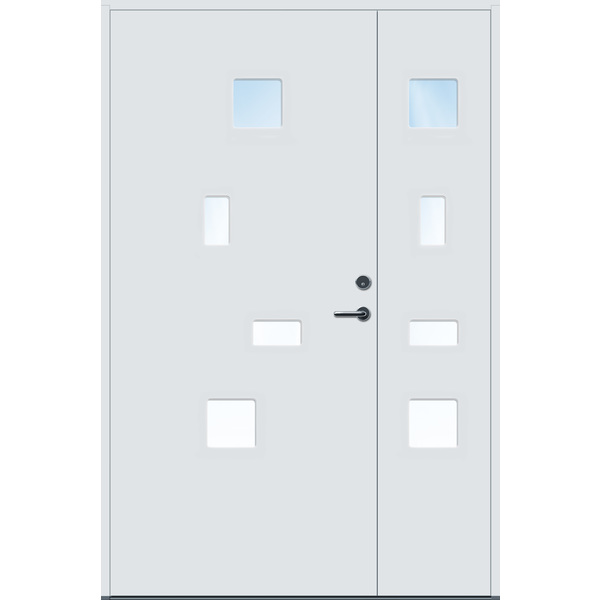 Ytterdør med minimalistisk stilreint design uten glasslister og med skjulte hengsler.Døren har god kvalitet og er behandlet for å tåle vårt nordiske klima. Ramtre av fingerskjøtt furu og laminert finer (LVL), 54 mm EPS isolasjon. Klart 3-lags glass er standard, men kan også lages med cotswold, crepi, frosta eller sota glass. Kvistfri furukarm 44x105 mm med terskel av eik og aluminium. FG beslag: Matt krom sylinder, låskasse Assa 8765 og to skjulte hengsler Tectus 340 3D. Standard farge på karm og dørblad er NCS S 0502-Y, andre farger på bestilling. U-verdi 1,40 W/m2. For mer informasjon se www.bygg1.no