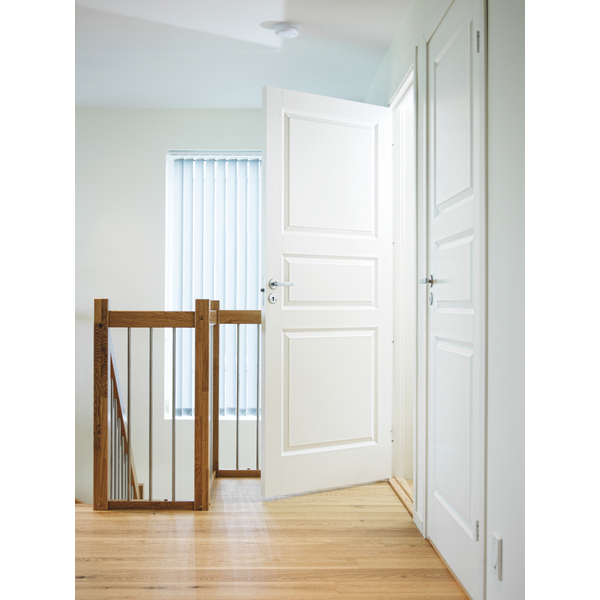 Formpresset lett innerdør med glass i tradisjonelt design og fin overflate. Et godt valg samtidig som det er et rimelig alternativ til kompakte dører. Med innfelt glass øker romfølelsen og lyset flyter fritt mellom rommene. Teknisk beskrivelse: 40mm dørblad, ramtre av MDF, kjerne av honeycomb, overflata er formpresset plate av MDF. Blank låskasse 2014 og to hvite snap-in beslag. Klart 4mm herda sikkerhetsglass er standard, dørene kan også lages med cotswold, crepi, frosta eller sota glass. Sprosser og glasslister i fargeekte PVC. Hvitmalt NCS S 0502-Y er standard, andre farger på bestilling. Dørene kan leveres i ulike varianter: Enfløya, tofløya, dør med sidefelt og som skyvedør. Skyvedører er plassbesparende og praktisk. Se mer informasjon på www.bygg1.no