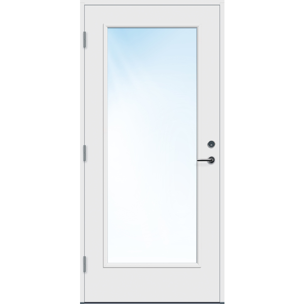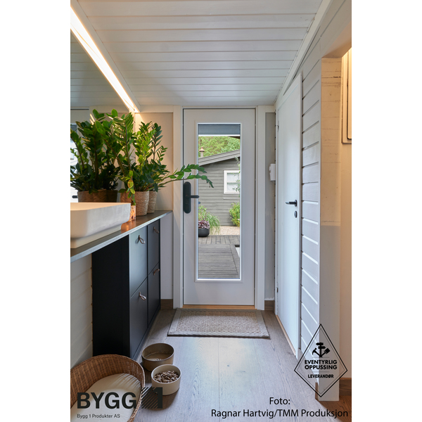 Ytterdør i moderne design med glass og god isolasjonsevne i høy kvalitet. Med hele fire strøk maling på utsatte steder og glasslister og sprosser i PVC, er døren konstruert for å tåle vårt nordiske klima. Klart 2-lags energisparende isolerglass er standard, men kan også lages med cotswold, crepi, frosta eller sota glass. Ramtre av fingerskjøtt furu og laminert finer (LVL) og 54 mm EPS isolasjon. Karm av kvistfri furu 44x105 mm. Terskel av eik og aluminium tilpasset bevegelseshindrede. Matt krom sylinder TV5596C, sluttstykke LP712, låskasse Assa 8765 og tre justerbare hengsler 3248-110 med bakkantsikring. Standard fargekode på karm og dørblad er NCS S 0502-Y, andre farger på bestilling. U-verdi 1,10 W/m2. For mer informasjon se www.bygg1.no