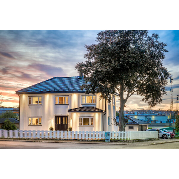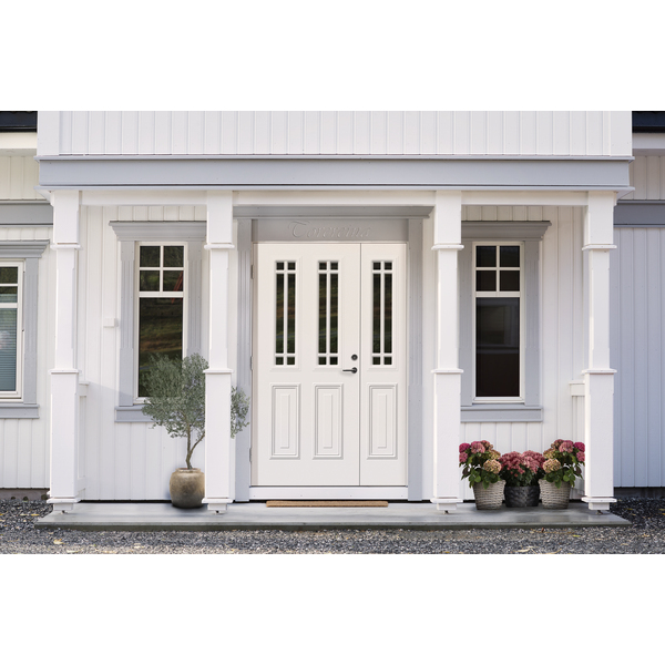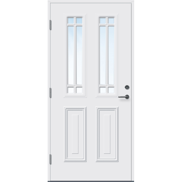 Ytterdør med glass i klassisk design med flott utenpåliggende dekor på utsiden og slett inside. Med fire strøk maling på utsatte steder er døren behandlet for å tåle vårt nordiske klima. Ramtre av fingerskjøtt furu og laminert finer, overflatemateriale av HDF. Klart 2-lags isolerglass er standard, men kan også lages med cotswold, crepi, frosta eller sota glass. Kvistfri furukarm 44x105mm med terskel av eik og aluminium. Matt krom sylinder TV5596C, sluttstykke LP712, låskasse Assa 8765 og tre justerbare hengsler 3248-110 med bakkantsikring. Standard fargekode på karm og dørblad er NCS S 0502-Y, andre farger på bestilling. U-verdi 1,0. Kan produseres som enkeltdør, dør med sidefelt og som tofløya. Tofløya dører er ikke likefløya pga. symmetri i dekor. Se mer informasjon på www.bygg1.no