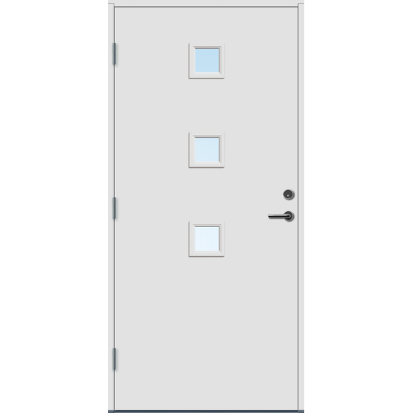 Ytterdør i moderne design med glass og god isolasjonsevne i høy kvalitet. Med hele fire strøk maling på utsatte steder og glasslister og sprosser i PVC, er døren konstruert for å tåle vårt nordiske klima. Klart 2-lags energisparende isolerglass er standard, men kan også lages med cotswold, crepi, frosta eller sota glass. Ramtre av fingerskjøtt furu og laminert finer (LVL) og 54 mm EPS isolasjon. Karm av kvistfri furu 44x105 mm. Terskel av eik og aluminium tilpasset bevegelseshindrede. Matt krom sylinder TV5596C, sluttstykke LP712, låskasse Assa 8765 og tre justerbare hengsler 3248-110 med bakkantsikring. Standard fargekode på karm og dørblad er NCS S 0502-Y, andre farger på bestilling. U-verdi 1,00 W/m2. For mer informasjon se www.bygg1.no