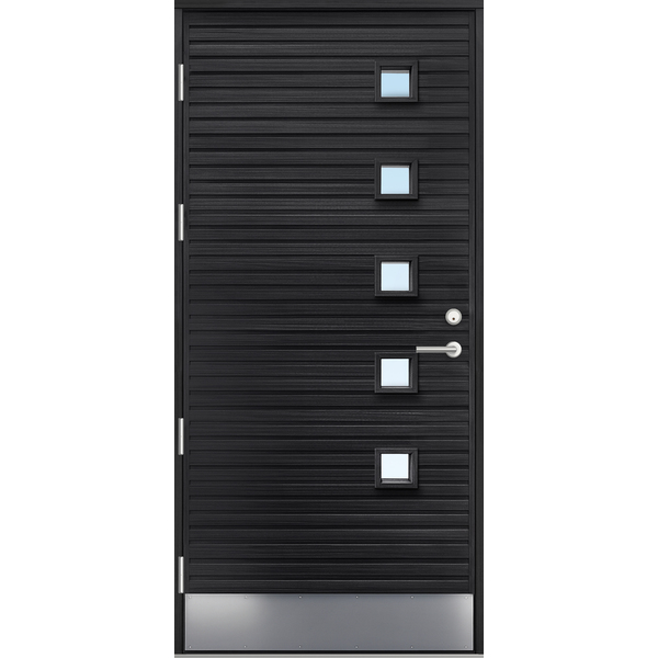 Ytterdør i eksklusiv og stilrent design. Dørene har kvistfri lakkert furupanel på innside og utside. Ramtre av kvistfri furu og 74mm resirkulert celluloseisolasjon. 53x128 mm karm av laminert, kvistfri furu. Fire hengsler (3stk M20/M19), dobbel pakning og 25mm HC terskel av lasert bjørk og aluminium. Karmene er forbora Ø14mm og det er montert 28mm karmhylse + løs 6.9x45 betong/treskru og plugg T8. FG låsesystem. Dørblad og karm er malt med hvit lasur og lakk som standard. Kan også leveres med brun eller svart lasur. U-verdi på 0,87.