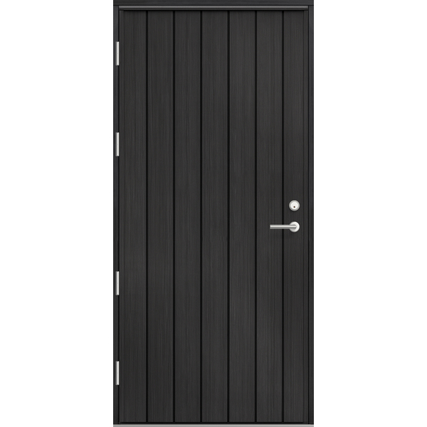 Ytterdør i eksklusiv og stilrent design. Dørene har kvistfri lakkert furupanel på innside og utside. Ramtre av kvistfri furu og 74mm resirkulert celluloseisolasjon. 53x128 mm karm av laminert, kvistfri furu. Fire hengsler (3stk M20/M19), dobbel pakning og 25mm HC terskel av lasert bjørk og aluminium. Karmene er forbora Ø14mm og det er montert 28mm karmhylse + løs 6.9x45 betong/treskru og plugg T8. FG låsesystem. Dørblad og karm er malt med svart lasur og lakk som standard. Kan også leveres med brun eller hvit lasur. U-verdi på 0,71.