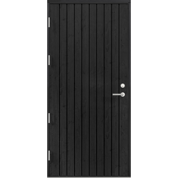 Ytterdør i eksklusiv og stilrent design. Dørene har kvistfri lakkert furupanel på innside og utside. Ramtre av kvistfri furu og 74mm resirkulert celluloseisolasjon. 53x128 mm karm av laminert, kvistfri furu. Fire hengsler (3stk M20/M19), dobbel pakning og 25mm HC terskel av lasert bjørk og aluminium. Karmene er forbora Ø14mm og det er montert 28mm karmhylse + løs 6.9x45 betong/treskru og plugg T8. FG låsesystem. Dørblad og karm er malt med svart lasur og lakk som standard. Kan også leveres med brun eller hvit lasur. U-verdi på 0,71.