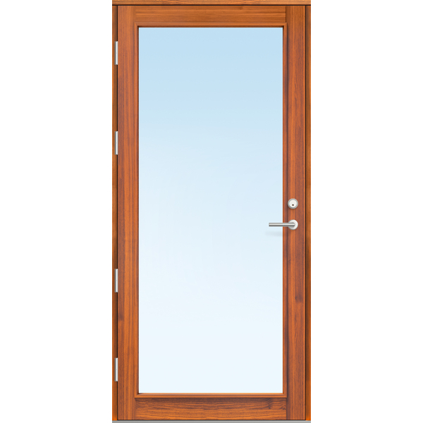 Ytterdør i eksklusiv og stilrent design. Dørene har kvistfri lakkert furupanel på innside og utside. 3-lags klart isolerglass med selektivt belegg og argongass. Ramtre av kvistfri furu og 74mm resirkulert celluloseisolasjon. 53x128 mm karm av laminert, kvistfri furu. Fire hengsler (3stk M20/M19), dobbel pakning og 25mm HC terskel av lasert bjørk og aluminium. Karmene er forbora Ø14mm og det er montert 28mm karmhylse + løs 6.9x45 betong/treskru og plugg T8. FG låsesystem. Dørblad og karm er malt med brun lasur og lakk som standard. Kan også leveres med hvit eller svart lasur. U-verdi på 1,00.