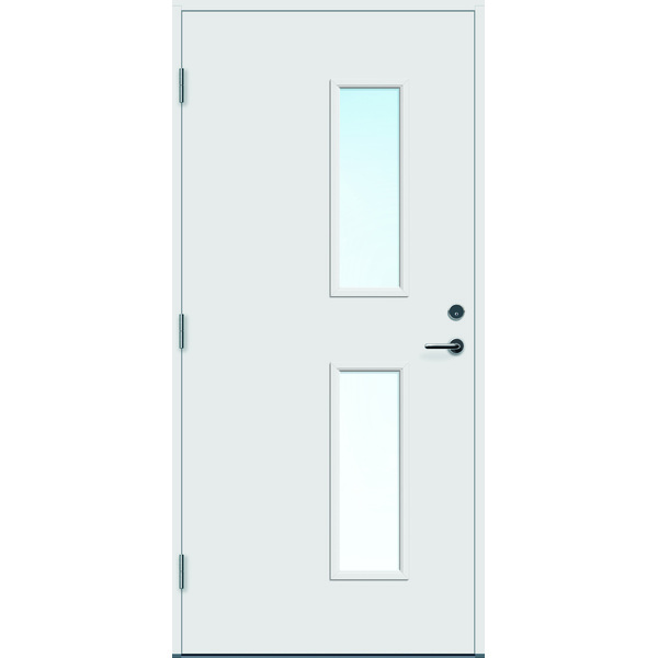 Ytterdør i moderne design med glass og god isolasjonsevne i høy kvalitet. Med hele fire strøk maling på utsatte steder og glasslister og sprosser i PVC, er døren konstruert for å tåle vårt nordiske klima. Klart 2-lags energisparende isolerglass er standard, men kan også lages med cotswold, crepi, frosta eller sota glass. Ramtre av fingerskjøtt furu og laminert finer (LVL) og 54 mm EPS isolasjon. Karm av kvistfri furu 44x105 mm. Terskel av eik og aluminium tilpasset bevegelseshindrede. Matt krom sylinder TV5596C, sluttstykke LP712, låskasse Assa 8765 og tre justerbare hengsler 3248-110 med bakkantsikring. Standard fargekode på karm og dørblad er NCS S 0502-Y, andre farger på bestilling. U-verdi 1,00 W/m2. For mer informasjon se www.bygg1.no