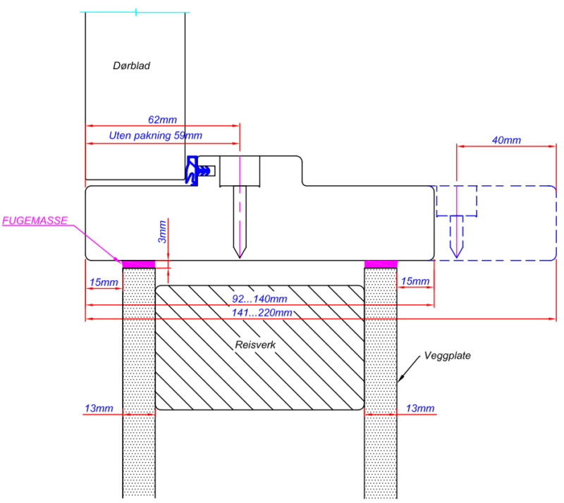 Ved bruk av skjulte hengsler i kombinasjon med gerikt, vil opningsvinkelen kunne bli redusert. Vi anbefaler difor kun listefri karm framfor standard karm med gerikt når skjulte hengsler er ynskja - både av praktiske og estetiske grunnar.